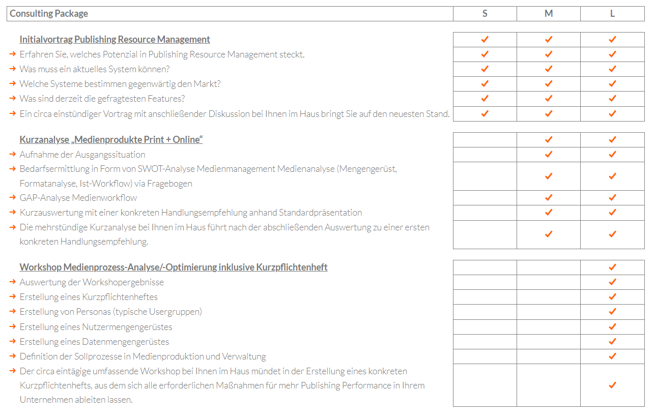 Sie haben die Wahl zwischen drei Consulting Packages in den Größen „S“ bis „L“. Die Spannbreite reicht dabei von einem Erstvortrag zu Publishing Resource Management über eine Kurzanalyse der Ist-Situation mit erster Handlungsempfehlung bis zum Komplettprogramm inklusive Erstellung eines umfassenden Kurzpflichtenhefts.