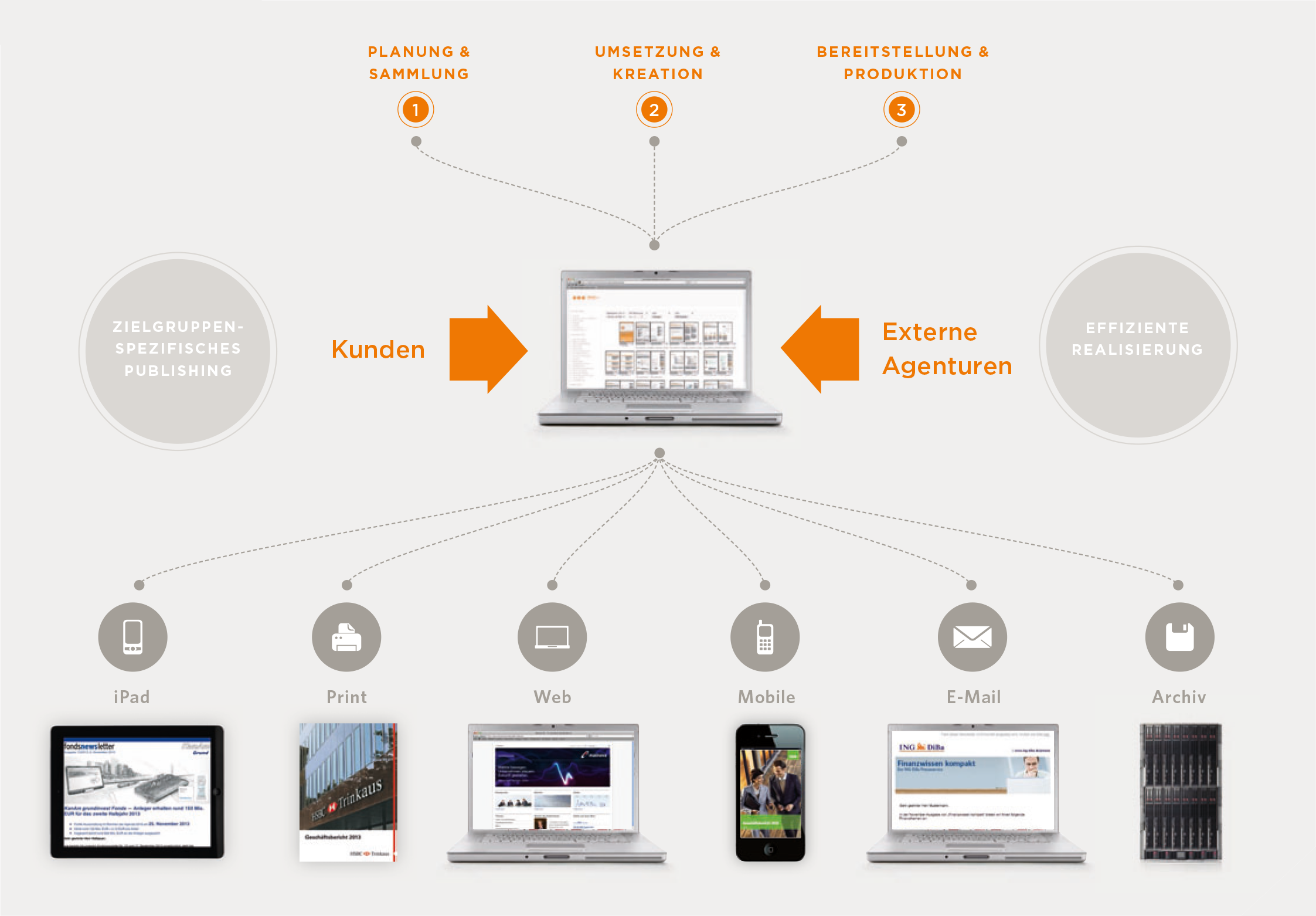 Multi-Channel-Publishing mit Redaktionssystem bedeutet hohe Medienabdeckung von Print über Online, Tablet, App bis Mobile bei gleichzeitig hoher Zeit- und Kostenersparnis.